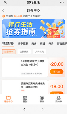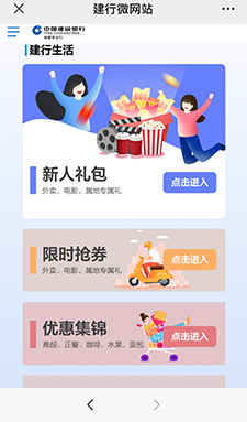 建行(xing)的微網站開發,包括快(kuai)捷支(zhi)付(fu)、信用卡(ka)、手機銀行(xing)、建行(xing)生(sheng)活、私行(xing)客戶專享(xiang)、善融優惠(hui)等服務(wu),集(ji)合了建行(xing)的促銷活動,綁(bang)定(ding)建行(xing)服務(wu)可得到更多優惠(hui)