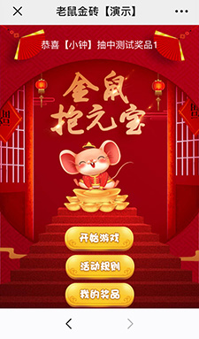 金鼠抱金磚,好運抱回家,好玩的游戲加上抽獎機制,鼓勵并引導分享朋友圈一起玩,以小游戲的低成本實現大價值。