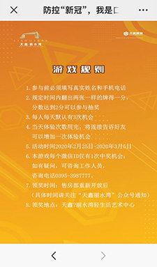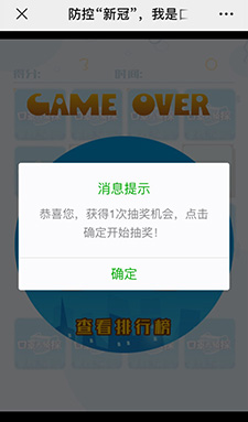 進入游戲——開始游戲——限制每天玩的次數——分享增加次數——達到一定分數可抽獎——查看我的獎品和活動規則、排行榜