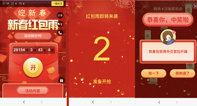 進入游戲——活動規則——開始搶——點開紅包,可能中獎,也可能不中獎——炫一下,發送朋友圈——查看我的收獲