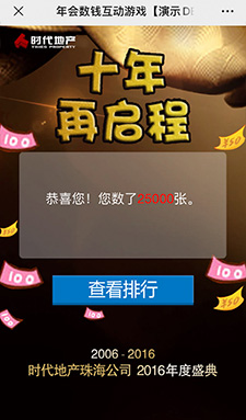 現(xian)場大屏(ping)幕數錢活動,互動性強,調動現(xian)場氣氛,也實現(xian)了公眾號(hao)增(zeng)粉效(xiao)果。我(wo)們提供更(geng)多定(ding)制開發服(fu)務,歡(huan)迎(ying)咨詢(xun)!