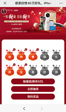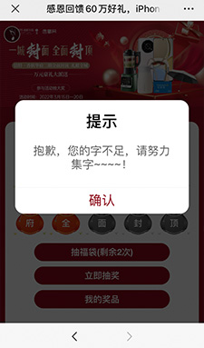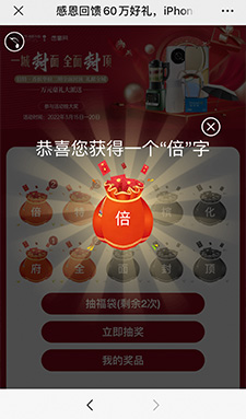 進入游戲——抽福袋——自己有x次集字機會——分享好友進行助力集字——集齊情況下可以抽獎,查看獎品、獲獎名單和活動規則