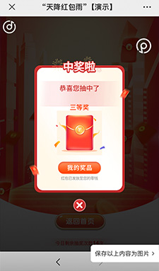 1、點擊掉落的紅包參與抽獎,每次可選擇其中1個紅包,活動期間每人每天可共選擇XX個紅包,有機會隨機獲贈價值不等的獎品;
