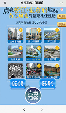 點亮城市地標,分享好友助力打卡地標,點亮所有地標可進行抽獎,線下核銷獎品,線上與線下活動密切結合,小成本實現大推廣。